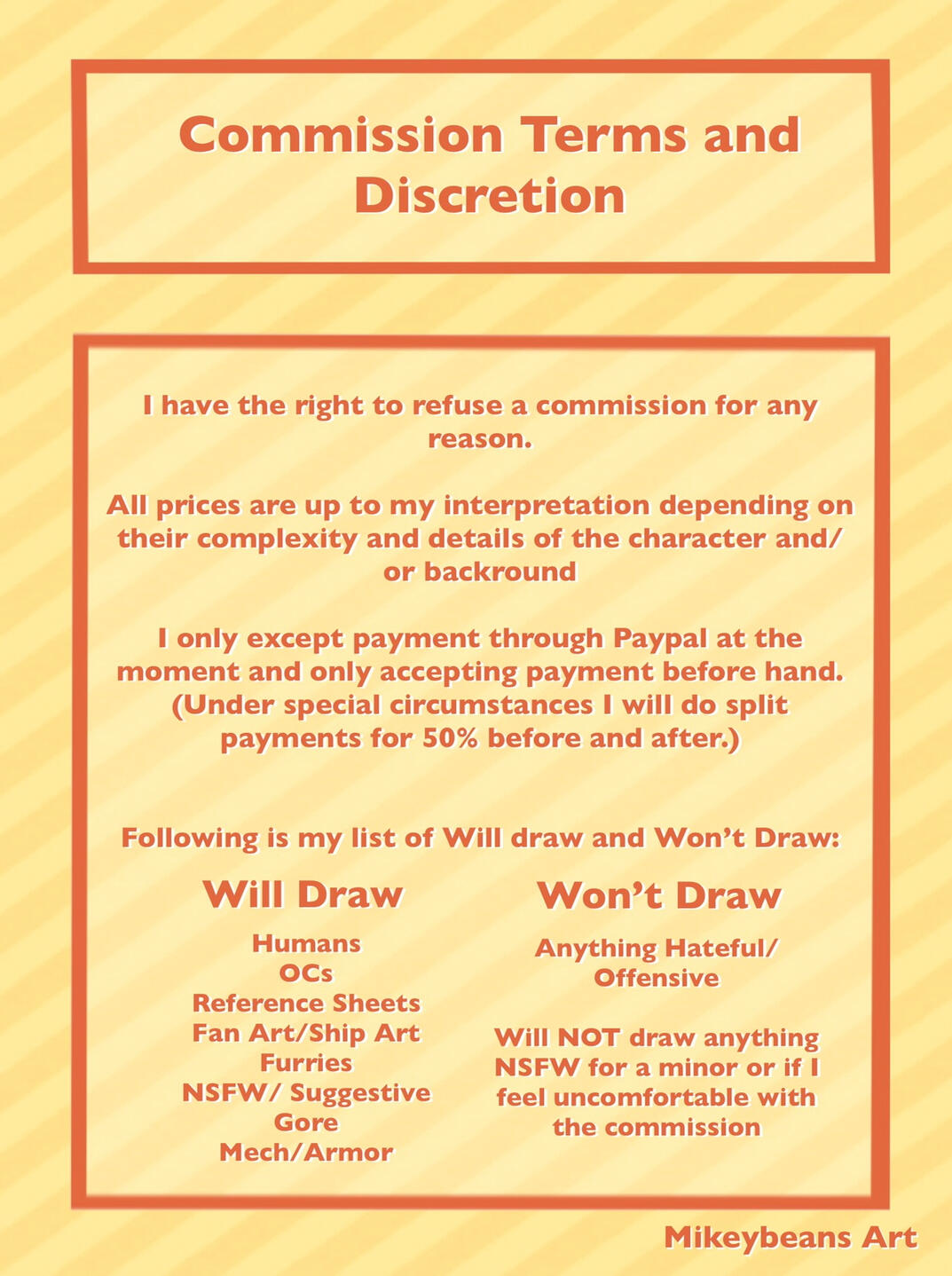If you are interested in commissions review my prices down below in the Gallery and Commission Terms and Discretion. For any questions, feel free to DM me on social media.